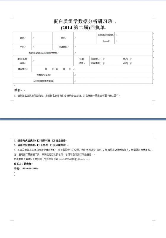 上海生咨生物科技有限公司盛情邀请您参加2014年10月30日至11月02日在上海举办的第二届以蛋白质组学数据分析为主的“蛋白质组学数据分析研习班“。在今年4月中旬我们已经成功举办了2014年第一届蛋白质组学数据分析研习班,有50余位来自全国各地的科研人员和老师参加,取得了较好的结果。本次研习班除了对蛋白质组学实验设计、数据分析方法和流程的介绍之外,我们将更加注重一些在线的工具和线下分析软件的实际应用。本次研习班将帮助研究人员深入了解当前蛋白质组学的关键实验技术和数据分析方法,开拓实验设计的思路,实际操作常用的蛋白质和蛋白质组数据分析方法,包括GO功能分类和富集分析、KEGG通路分析、网络分析、聚类分析等。研习班将由多年从事蛋白质组学和生物信息学研究的科研人员和专家共同授课,通过深入浅出的理论讲解和实例操作,帮助学员拓展研究思路,提升科研水平,增加职业竞争力。承办单位:上海生咨生物科技有限公司 主办单位:上海产业技术研究院药物转化创新中心 支持单位:杭州谷和信息技术有限公司 时间:2014年10月30日-2014年11月02日 地点:上海良友饭店;上海市静安区南苏州路1455号 注:关于此次会议的详细介绍和安排请下载附件“邀请函”查看,预参会的老师可将附件的“回执单”发回我邮件登记即可。 联系人: 杨老师 (mica346726696@163.com) 手机:185-0170-2880; 蛋白质组学数据分析研习班(2014第二届)邀请函.jpg 蛋白质组学数据分析研习班—回执单.jpg [ Last edited by 杈杈 on 2014-9-26 at 10:22 ] |