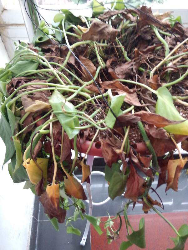 这应该是绿萝,看样子是根系受损导致不能吸收水肥,再缓缓吧
