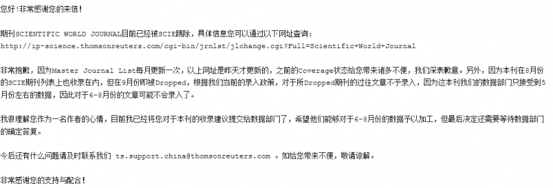 Scientific World Journal编辑部关于被SCIE直接踢掉给我的邮件回复 已有49人参与