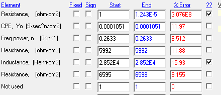 镁合金表面成膜 HANKS'溶液(类体液) 测试 阻抗谱 如下 应该是有第一象限的两个容抗弧和第四象限的感抗弧组成 采用一般的有机涂层等效电路分析图2 Rs(Q(R(CR)))模拟结果如下 这样的话Rs值很大 求教 等效电路选择对吗? 感抗弧怎么解释? 附加感抗.png 等效电路111.png 数值.png |