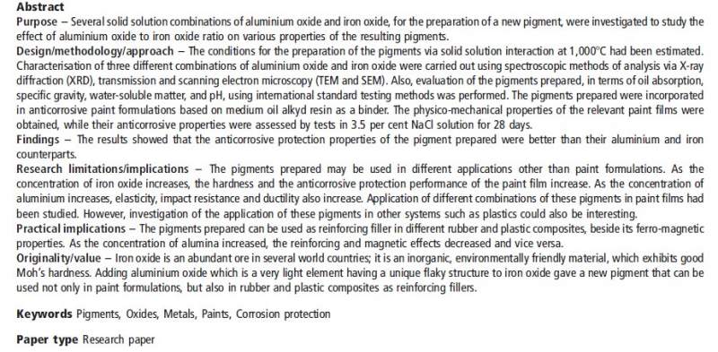 Originality/value – Iron oxide is an abundant ore in several world countries; it is an inorganic, environmentally friendly material, which exhibits good Moh’s hardness. Adding aluminium oxide which is a very light element having a unique flaky structure to iron oxide gave a new pigment that can be used not only in paint formulations, but also in rubber and plastic composites as reinforcing fillers.