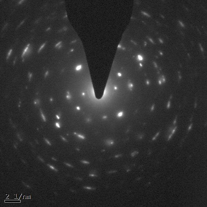 应该是单晶。但是在你选区的位置可能厚度太厚,或者有堆积现象,造成衍射图像不清晰! 需要选比较薄的地方做衍射。还有结晶度不够高也可能出现这样的情况! |