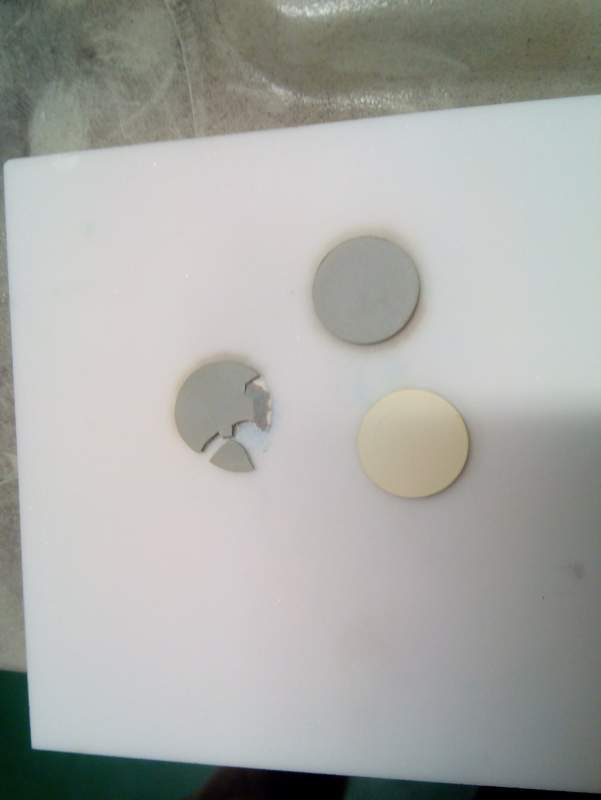 本人烧结GDC陶瓷片,温度1500℃,保温时间10小时,发现粘垫板(氧化锆版)现象,而且颜色变为灰绿色,第二次烧,在陶瓷片下垫GDC粉末,发现粉末跟变成泥状似得黏在垫板上而且渗入陶瓷片中。 求高人指点,感激不尽! 第一次烧,两个变色 垫板变成泥状.jpg |