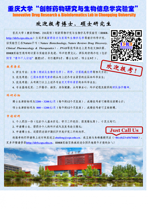 重庆大学(教育部985,211高校)创新药物研究与生物信息学实验室(IDRB,http://idrb.cqu.edu.cn)主要开展新药设计与发现和生物信息学等前沿科学研究。 欲报考的同学请将上述材料发送至zhufeng@cqu.edu.cn,或直接与朱峰教授联系(+86-(0)23-65678468),更多详情请登录http://idrb.cqu.edu.cn。 详情请看图片,更多详情请参阅实验室网页 IDRB2015年博士硕士招生.png |