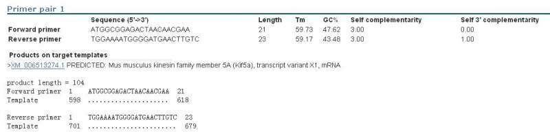 高手给我看看这两条引物,设计的是老鼠KIF5A基因,5‘-atggcggagactaacaacgaa-3’ 5‘-tggaaaatggggatgaacttgtc-3’;5‘-aagcttcaggccgactatga-3’ 5‘-ttgtggagggtctggagttc-3’,这两条引物哪一条更适合做荧光定量PCR,为什么? |