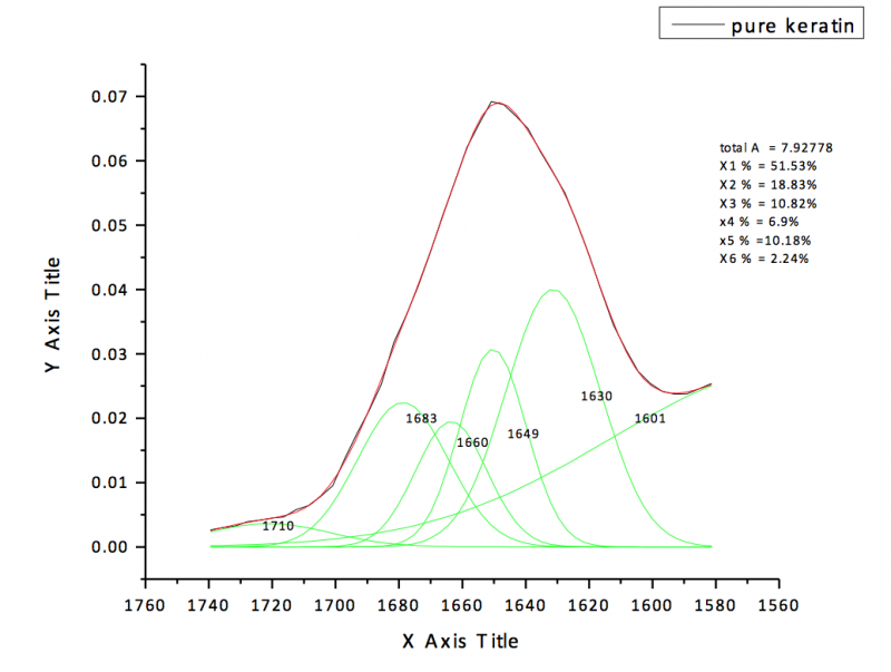 这是我对羊毛角蛋白溶液的红外测试的部分数据,现在想了解其二级结构,故对其在酰胺i带(1580~1740)进行了分峰,但是结果总是和文献结果不同,求助求助啊!!! 屏幕快照 2014-09-22 16.27.11.png |