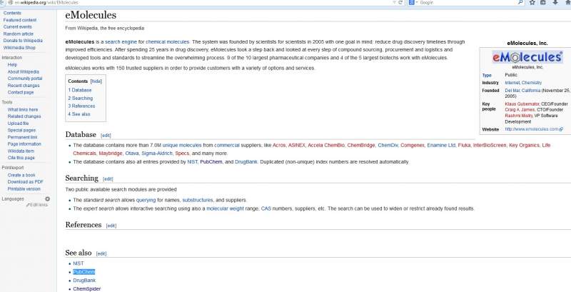 [ 感谢奖赏 ] 来源: [ 记得点查 wikipedia 网页底 “类似的网站” ] 图1 = https://en.wikipedia.org/wiki/EMolecules 图2 = https://en.wikipedia.org/wiki/PubChem 供应商付费被入列, 在线查货不必付费 ============================= [wikipedia] eMolecules.jpg [wikipedia] 像 PubChem.jpg |