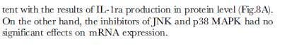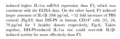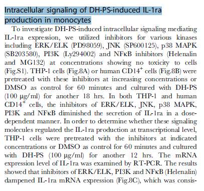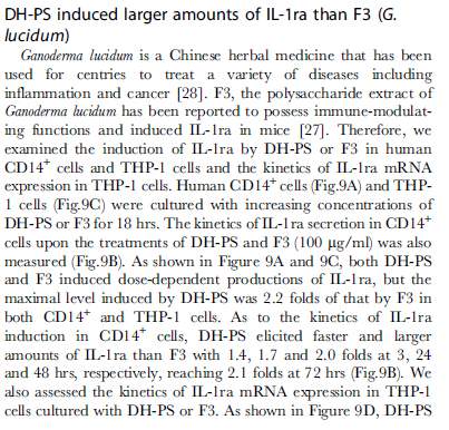 在单核细胞中DH-PS诱导产生IL-1ra的细胞内信号途径 为研究介导DH-PS诱导IL-1ra表达的细胞内信号途径,我们利用各种蛋白激酶的抑制剂,包括ERK/ELK(PD98059),JNK(SP600125),p38 MAPK(SB203580),PI3K(LY294002)和NFκB抑制剂(Helenalin和MG132),这些抑制剂的使用浓度对细胞无毒性(Fig.S1)。 THP-1细胞(图8A)或人CD14+细胞(图8B)预先用不同浓度的这些抑制剂或DMSO作对照处理60分钟,然后向培养基中加入DH-PS(100微克/毫升)继续培养18小时。在THP-1和人CD14+细胞中,ERK/ELK,JNK,p38 MAPK,PI3K和NFκB的抑制剂降低IL-1ra的分泌,且呈剂量依赖性。为了确定这些信号分子是否在转录水平上调节了IL-1ra,用给定浓度抑制剂或DMSO预处理THP-1细胞60分钟,再用含DH-PS(100微克/毫升)的培养基继续培养12小时。用RT-PCR检测IL-1ra mRNA的表达水平。结果表明,ERK/ELK,PI3K和NFκB(Helenalin)的抑制剂抑制IL-1ra mRNA的表达(图8C),这与在蛋白水平得到的有关IL-1ra产生的结果(图8A)是一致的。另一方面,JNK和p38 MAPK的抑制剂对IL-1ra mRNA表达无显著效果。 DH-PS比F3(灵芝)诱导更多IL-1ra 灵芝是一种用了几个世纪的中草药,主要用于治疗包括炎症和癌症等多种疾病[28]。 F3是灵芝多糖提取物,已被报道在小鼠具有免疫调节功能并诱导IL-1ra【27】。因此,我们研究了DH-PS或F3对人CD14+细胞和THP-1细胞产生IL-1ra的诱导作用以及IL-1ra mRNA在THP-1细胞表达的动力学。人CD14+细胞(图9A)和THP-1细胞(图9C)与不同浓度的DH-PS或F3培养18小时。同时研究了CD14+细胞经DH-PS和F3(100微克/毫升)处理后IL-1ra分泌的动力学(图9B)。如图9A和9C所示,DH-PS和F3都可以诱导IL-1ra的产生,且具有剂量依赖性特点,但DH-PS诱导的最大水平是F3的2.2倍,这在CD14 +和THP-1细胞是一致的。至于在CD14+细胞中IL-1ra诱导的动力学,DH-PS的诱导作用比F3更快且诱导程度更大,在3,24和48小时时对IL-1ra的诱导分别是1.4,1.7和2.0倍,72小时时达2.1倍(图9B)。我们还研究了DH-PS或F3在THP-1细胞对IL-1ra mRNA表达的动力学。如图9D所示,DH-PS对IL-1ra mRNA诱导程度比F3更高,这和ELISA数据是一致的。另一方面,F3在三个健康供体所提供的CD14+细胞中比DH-PS诱导产生更多IL-1β:F3对IL-1β的诱导(366皮克/毫升,约为PBS对照的52倍)(Fig.S3);DH-PS对IL-1β的诱导(3个健康供体分别为55,24和70皮克/毫升图4)。 |