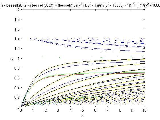 如果使用ezplot命令会产生非常多的断点,由于该色散方程为超越方程,故会有好几组曲线,ezplot不能约束某一条,我所得结果如下: