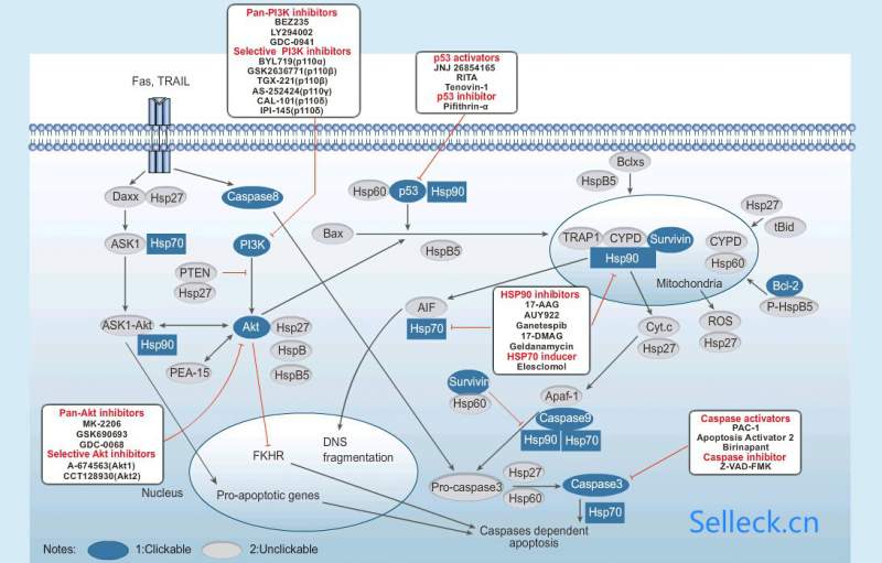 产品描述: 17-AAG (Tanespimycin)是一种有效的HSP90抑制剂,IC50为5 nM,作用于从肿瘤细胞提取的HSP90比作用于从正常细胞提取的HSP90结合亲和力高100倍。Phase 2。 靶点: HSP90 IC50: 5 nM 信号通路图: 体外研究: 17-AAG是格尔德霉素类似物, 但是与过量表达HER-2的癌细胞 (BT474, N87, SKOV3 和SKBR3)或BT474乳腺细胞衍生的Hsp90亲和力高100多倍,IC50为5-6 nM, 而作用于正常人类原代细胞时,IC50为400-943 nM, 因为肿瘤Hsp90 处于多伴复合体状态,具有高ATP酶活性,而正常细胞Hsp90 处于潜在未结合状态, 且直接与那些细胞中17-AAG毒性相关。17-AAG 引起HER2, HER3, Akt,突变和野生型雄激素受体(AR)降解,导致前列腺细胞如LNCaP, LAPC-4, DU-145,和PC-3中RB依赖的 G1 期生长停顿,IC50为25-45 nM。除了诱导改变野生型BCR-ABL的Ba/F3细胞凋亡, IC50为5.2 μM, 17-AAG还通过诱导野生型和突变型 BCR-ABL蛋白降解,而诱导改变抗 Imatinib Mesylate的 T315I和 E255K BCR-ABL突变型细胞生长,IC50分别为2.3 μM 和 1.0 μM。 体内研究: 17-AAG作用于携带3T3-src, B16或CT26移植瘤裸鼠,与Hsp90结合具有高亲和力,IC50为8-35 nM,而作用于正常组织时,IC50为200-600 nM。 17-AAG按50 mg/kg左右剂量处理,引起AR, HER2, HER3, 和 Akt表达明显降低,降低达50%以上,这种作用存在剂量依赖性,结果导致雄激素依赖型 (CWR22)和非依赖型(CWR22R 和CWRSA6) 前列腺移植瘤生长受抑制,抑制率分别为67%, 80%和 68%。 特征: 17-AAG对正常细胞的毒性很小。 |