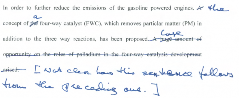 写了一篇关于三效催化的文章,编辑亲笔给我改了一句话,但是我看不懂这句英语。 已有2人参与