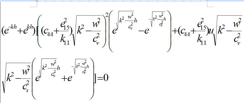 就是这个方程,其中就只有w是未知数,而且我知道w的范围 以下是matlab的程序: clc;clear; c44=2.56e+10; e15=12.7; k11=64.6e-10; p=7500; u=2.65e+10; pm=2706; h=0.001; cv=sqrt(0.674e+7); cs=sqrt(0.979e+7); K=10,W在(8210,9894)范围内 AA=(exp(-10*h)+exp(10*h))*(((c44+e15^2/k11)*sqrt(100-x^2/cv^2))^2*(exp(h*sqrt(100-x^2/cv^2))-exp(-h*sqrt(100-x^2/cv^2)))+(c44+e15^2/k11)*u*sqrt(100-x^2/cv^2)*sqrt(100-x^2/cs^2)*(exp(h*sqrt(100-x^2/cv^2))+exp(-h*sqrt(100-x^2/cv^2)))) 要求w,且w是多解的!! |