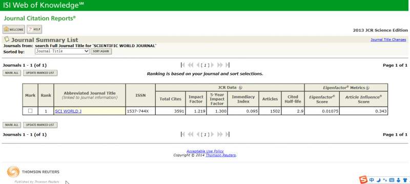 今天偶然在学校图书馆的Web of Science系统查询了一下scientific world journal期刊的影响因子,发现居然还能查到最新13年影响因子为1.219(截图见附件),这是为什么啊? 影响因子截图.jpg |
