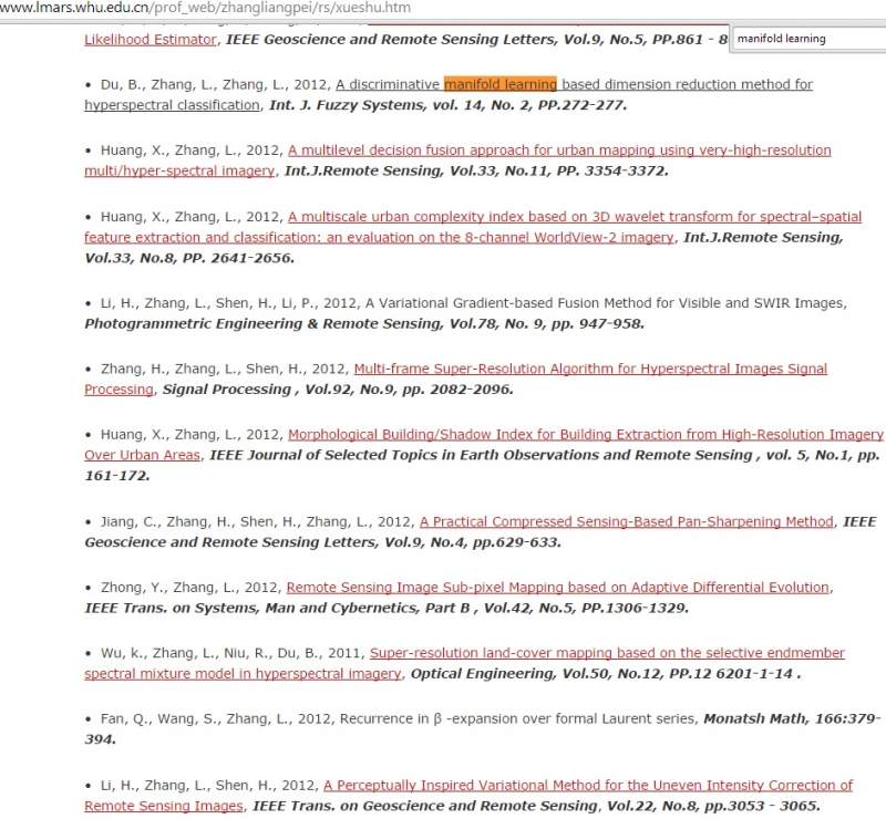 百度文库里有很多基础资料,但我比较喜欢这个 [图1] https://blog.sciencenet.cn/blog-722391-583413.html 张良培教授写了一篇相关文章 [图2] https://www.lmars.whu.edu.cn/prof_web/zhangliangpei/rs/xueshu.htm 数学深不可测 !!... 但张教授的文章几乎全都可下,主页措辞和蔼,想必真有本事,又肯引学子入门 [图3] https://www.lmars.whu.edu.cn/prof_web/zhangliangpei/rs/ 试试吧.... 祝你成功 !! ---------------------------------- Manifold Learning 简介.jpg 张良培 教授文章.jpg 张良培 教授主页.jpg |