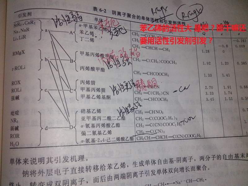 楼主说的苯乙烯单体活泼是在自由基聚合里面的,这两个图是指阴离子聚合的,阴离子中苯乙烯的确实不如下面那几组的活性强,另外阴离子共聚中如何先加和后加楼主可以看看书第172页的上面的话,感觉比较详细。
