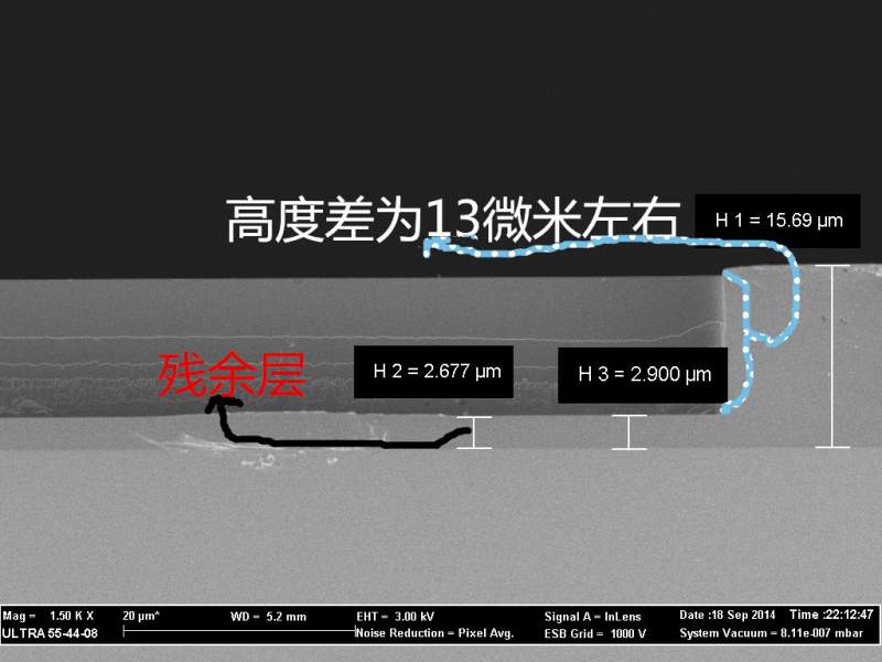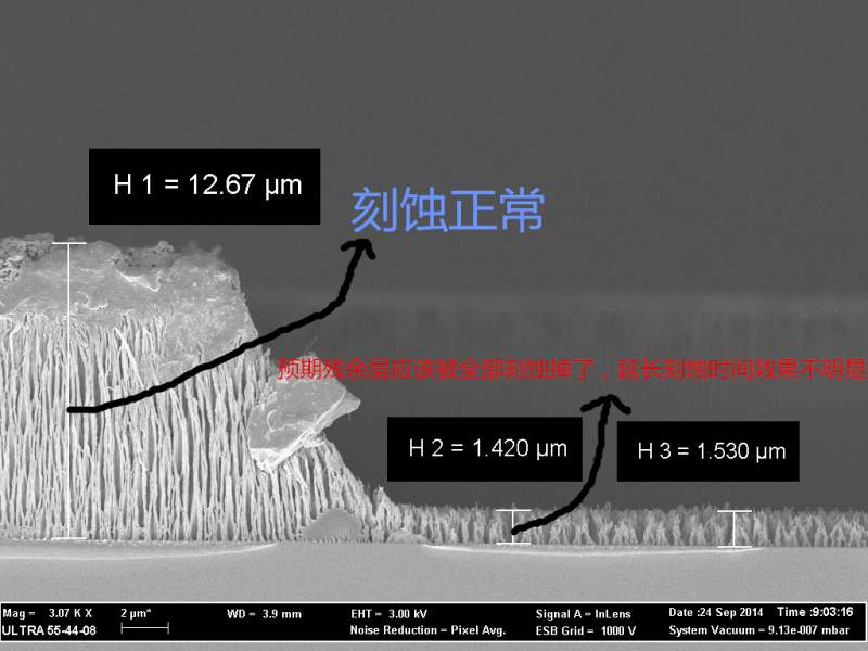 请问有没有同学用ICP刻蚀常见光刻胶su8的结构层?我用压印的方法做的结构,然后用ICP氧等离子体刻蚀残余的su8胶层。 但是发现刻蚀到一定程度后发现,残余层刻蚀不动了,结构别的地方刻蚀正常。请教大神如何解决,万分感谢。 (残余层距离结构顶端大约13微米左右) 附图刻蚀前后截面SEM照片。 刻蚀后刻不动.jpg 刻蚀前 .jpg |