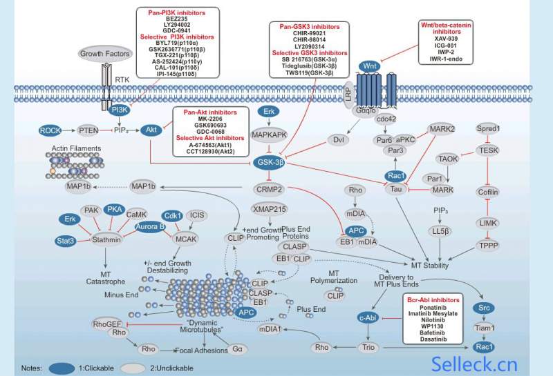 一、简介: Docetaxel,一种紫杉醇类似物,通过结合到稳定的微管来抑制微管解聚。 二、信号通路图: 三、体外研究: Docetaxel是一种细胞毒性剂,尤其对于增殖细胞,Docetaxel促进微管蛋白束的形成,还能诱导持续的有丝分裂阻滞,随后分裂阻滞的细胞凋亡或永久抑制分裂。 Docetaxel抑制微管的动态不稳定性及踏车现象,导致染色体不能分开到子细胞中,这样又会反过来触发有丝分裂过早结束,而不是在细胞周期的特定时期进行抑制作用。 Docetaxel (150 ng/mL) 处理人类小细胞肺癌 N417细胞系 1小时,抑制50% 细胞生长。在体外,Docetaxel在极低浓度时,抑制内皮细胞迁移,这并不影响微管的大体形态或抑制细胞增殖,对微管动力学产生更微妙的影响。Docetaxel 抑制 HUVEC 迁移,IC50 为1 pM。Docetaxel 抑制血管生成因子胸甘磷酸化酶或血管内皮生长因子刺激的HUVEC趋化性,IC 50 为10 pM 。 Docetaxel (30 μM) 在添加10%人血清的培养基中温育12小时,诱导人单核细胞。 四、体内研究: Docetaxel (33 mg/kg/dose, 静脉注射,每四天注射3次) 处理M2OL2 结肠移植瘤,结果肿瘤生长延迟19.3。Docetaxel作用于MX-1, SK-MEL-2, LX-1 和 OVCAR-3 移植瘤,也具有很强的抗肿瘤活性。Docetaxel抑制成纤维细胞生长因子2的血管反应,IC50为5.4 mg/kg,Docetaxel按10 mg/kg剂量处理小鼠,在14天期间,每周注射两次,结果血管完全堵塞。Docetaxel对内皮细胞迁移和/或微血管形成具有选择性,因为炎症细胞浸润到基底膜对Docetaxel抑制不太敏感。 |