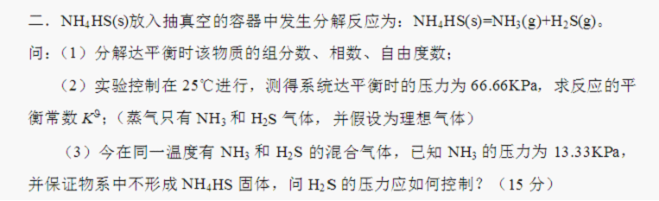 组分3,相数2,自由度1;平衡常数=(33.33/100)^2=0.1111 ;最大压力,13.33*p=33.33^2,即得压力为83.33kPa