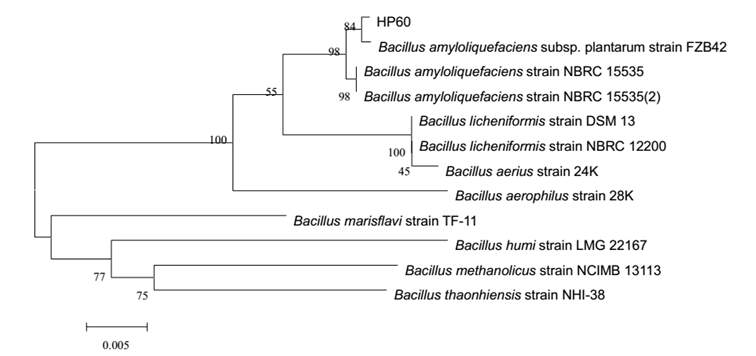 大家好: 测序是送CCTCC测得,16S rRNA序列。 序列BLAST后搜到几十株同源性在92%以上的菌株,选取97%以上的10株左右,最高的99%同源性然后借助MEGA5.0,Neighbor-Joining Tree分析法构建系统发育树并通过Bootstrap method 1000,在最终获得发育树,见下图。但是不知道怎么分析,因为写文章不可能就把树摆上完了,我不会专业的分析。求教专家的虫友帮忙分析一下 |