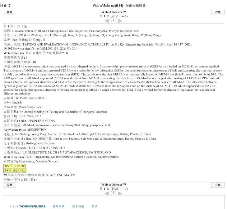 MCM-41 mesoporous silica was prepared by hydrothermal method. 2-carboxyethyl phenyl phosphinic acid (CEPPA) was loaded on MCM-41 by solution method. The structure of MCM-41 and its supported CEPPA was studied by X-ray diffraction (XRD), transmission electron microscope (TEM) and scanning electron microscopy (SEM) coupled with energy dispersive spectrometer (EDS). The results revealed that CEPPA was successfully loaded on MCM-41 with Si/P molar ratio of about 20: 1. The XRD spectrum of MCM-41 supported CEPPA was different from MCM-41, indicating the structure of MCM-41 was changed after loading of CEPPA. CEPPA molecule moved into the mesoporous structure and filled in the mesopores, leading to the disappearance of characteristic diffraction peaks of MCM-41. The interaction between hydroxyl group of CEPPA and silanol of MCM-41 made it stable for CEPPA to be in the mesopores and on the surface of MCM-41. MCM-41 supported CEPPA also showed the similar mesoporous structure with long-range order to MCM-41 when observed by TEM. SEM provided further evidences of the similar particle size and different morphology. © (2014) Trans Tech Publications.