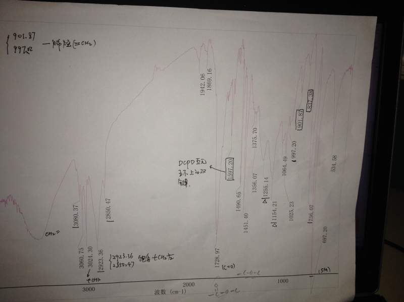 图为不饱和聚酯树脂固化后的红外光谱图,通过与聚苯乙烯红外光谱图对比后发现,只有三个地方不同于聚苯乙烯,分别是1728、1154和1255,知道1728代表羰基了,请问1154(±5)和1255(±5)分别代表什么基团?如图所示,请赐教,不胜感激! IMG_0430.JPG |
