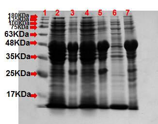 Lane6: 37℃ 3h诱导后上清,IPTG终浓度为0.4M;