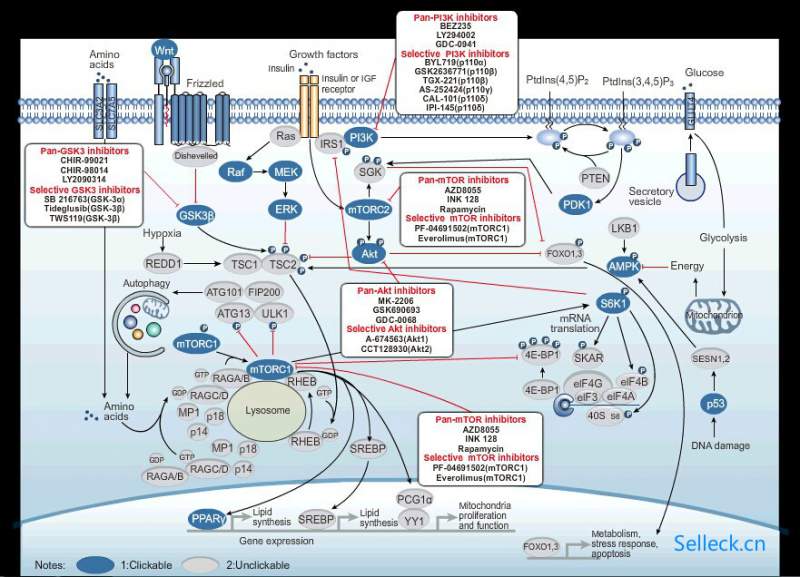 一、 mTOR的介绍 激酶蛋白mTOR通过调控mRNA翻译成为具有多种细胞功能的蛋白质来整合细胞对于外界刺激的反应。Hsieh等和Thoreen等利用一种称为核糖体分析的技术探究了全基因组水平上受到mTOR调控的mRNAs。通过利用分子PP242或Torin 1抑制mTOR活性,研究人员证实根据RNA碱基的序列特征,可将mTOR-调控的mRNAs分为3种类型(5'TOP,PRTE 或5'TOP样)。然而,也有可能mTOR还调控了包含其他新翻译调控元件(NTRE)的mRNAs的翻译。 二、 信号通路图 三、 抑制剂Everolimus 药品描述: Everolimus (RAD001)是一种mTOR抑制剂,作用于FKBP12,IC50为1.6-2.4 nM。 靶点 mTOR (FKBP12) IC50 1.6 nM-2.4 nM 体外研究: 体外, 与Rapamycin相比,Everolimus 具有抑制免疫活性。Everolimus与固定化的FK 506竞争性结合到生物素化的FKBP12上,IC50为1.6 nM-2.4 nM,且作用于BALB/c和CBA小鼠脾脏细胞,抑制双向MLR,IC50为0.12 nM-1.8 nM。Everolimus 作用于VEGF诱导的HUVEC增殖和bFGF诱导的 HUVEC增殖,具有抗血管生成/血管效果,IC50分别为0.12 nM和 0.8 nM。最新研究显示Everolimus抑制BT474 细胞系和原发性乳腺癌细胞的全部细胞和干细胞,作用于原发性乳腺癌的全部细胞时IC50为 156 nM,作用于BT474细胞的全部细胞时,IC50为71 nM。此外, Everolimus和Trastuzumab联用,显著促进对肿瘤干细胞生长的抑制作用,抑制率提高50%以上。 体内研究: Everolimus (0.1 到 10 mg/kg)抑制B16/BL6黑色素瘤的原代生长和淋巴结转移,伴随着全部血管数降低,这种作用存在剂量依赖性。 Everolimus作用于携带BT474干细胞移植瘤动物模型,与对照组相比(体积为698 mm3),显著降低平均肿瘤尺寸(590.6 mm3)。而且,与 Everolimus单独处理相比,Everolimus和Trastuzumab联用显著降低移植瘤尺寸 (410.8 mm3)。 |