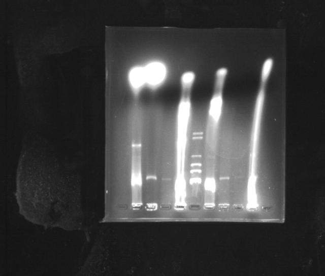 有两个问题,一、确定你的琼脂糖都溶解了吗,感觉你的胶好像有问题,电泳跑的不好看;二、减少上样量,重跑,一个孔有一微克就够了