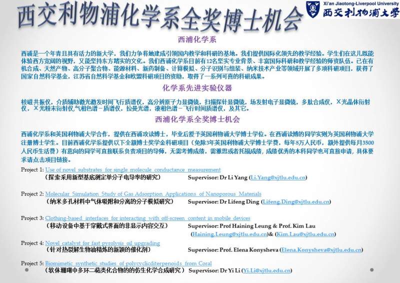 西交利物浦化学系 西浦是一个年青且具有活力的新大学,我们力争将她建成引领国内教学和科研的基地。我们提供国际化领先的教学经验。学生们在这儿既能体验西方宽阔的视野,又能坚持东方踏实的文化。我们西浦化学系目前有12名坚实专业背景、丰富国际科研和教学经验的师资队伍。已在有机合成、天然产物、高分子聚合物、能源材料、新药制备、计算模拟、分子识别与组装、纳米技术产业等领域开展了多项科研项目,获得了国家自然科学基金,江苏省自然科学基金和欧盟科研项目的资助,取得了一系列可喜的科研成果。 化学系先进实验仪器 核磁共振仪,介质辅助激光激发时间飞行质谱仪,高分辨原子力显微镜,扫描探针显微镜,场发射电子显微镜,多肽合成仪,X光晶体衍射仪,X光粉末衍射仪,气相色谱-质谱仪,拉曼光谱,液相色谱-飞行时间质谱仪,及其它。 西浦化学系全奖博士机会 西浦化学系和英国利物浦大学合作,提供在西浦攻读博士,毕业后授予英国利物浦大学博士学位。在西浦读博的同学实则为英国利物浦大学注册博士学生。目前西浦化学系提供以下全额博士奖学金科研项目(免除3年英国利物浦大学博士学费,每年8万人民币,额外提供每月3500人民币生活费)有意向的同学可直接联系负责项目的导师,无需考博成绩,需雅思或者托福成绩, 成绩优秀的本科同学也可直接申请, 具体要求请点击项目链接。 Project 1: Use of novel substrates for single molecule conductance measurement (探索采用新型基底测定单分子电导率的研究) Supervisor: Dr Li Yang (Li.Yang@xjtlu.edu.cn) Project 2: Molecular Simulation Study of Gas Adsorption Applications of Nanoporous Materials (纳米多孔材料中气体吸附和分离的分子模拟研究) Supervisor: Dr Lifeng Ding (Lifeng.Ding@xjtlu.edu.cn) Project 3: Clothing-based interfaces for interacting with off-screen content in mobile devices (移动设备中基于穿戴式界面的非显示内容交互) Supervisor: Prof Haining Leung & Prof. Kim Lau (Haining.Leung@xjtlu.edu.cn)& (Kim.Lau@xjtlu.edu.cn) Project 4: Novel catalyst for fast pyrolysis oil upgrading (针对热裂解生物油精炼的新颖的催化剂) Supervisor: Prof. Elena Konysheva (Elena.Konysheva@xjtlu.edu.cn) Project 5: Biomimetic synthetic studies of polycyclicditerpenoids from Coral (软体珊瑚中多环二萜类化合物的的仿生化学合成研究 ) Supervisor: Dr Yi Li (Yi.Li@xjtlu.edu.cn) Flyer_chemistry_PhD_opportunities.jpg 具体项目信息请点击项目链接 [ Last edited by lding351 on 2014-10-24 at 16:33 ] |