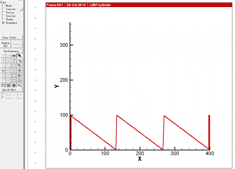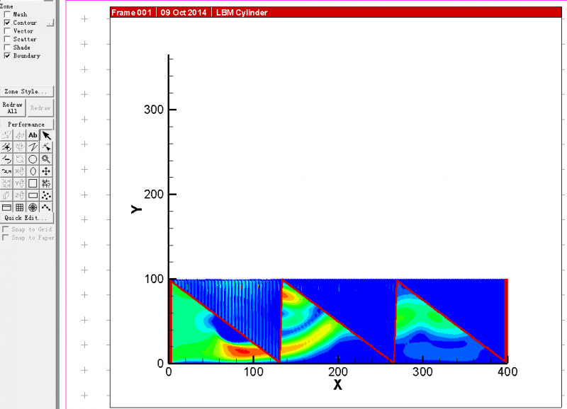 做LBM圆柱绕流计算后将数据导入tecplot画contour图,发现边界变成了附件中的样子,同样的数据用matlab画图没有异常。