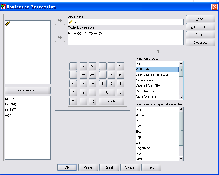 哪位大神帮忙求解 方程y=a+{(b-a)/(1+10^[(m-x)*c)]},已知x,y值,求解(1)a,b,c,m值(2)m值的95%置信区间.用SPSS如何操作? x y -30.0 1.0 -0.698970004 0.908018198 -0.397940009 0.759213831 -0.22184875 0.552014559 -0.096910013 0.306860783 0.0 0.253619654 0.301029996 0.0 |