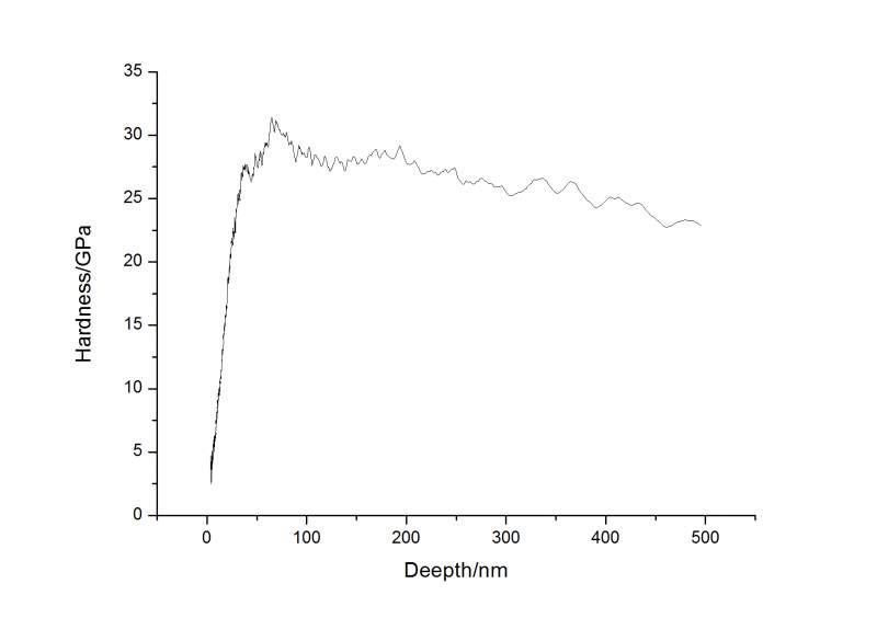 请教各位,这是我用Origin画出的硬度曲线,峰值时该样品的硬度么,还是峰值之后的平缓区时,如果是后者,平缓区应该去多长距离来算平均硬度值?