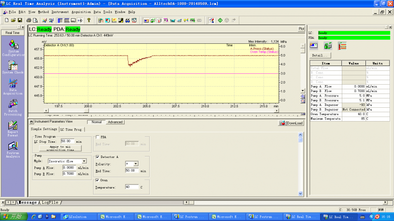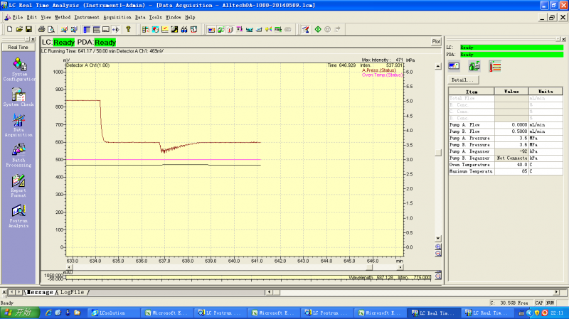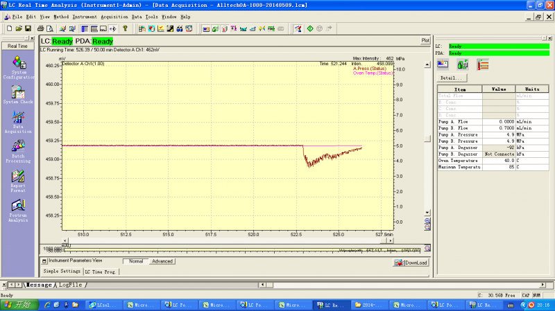 | 楼主 柱子没接好 或管路连接不好吧 压力才5Mpa 相当于70psi左右,基本上相当于柱前压,先检查一下管路是否连接好了,或者有没有漏液的地方 |
