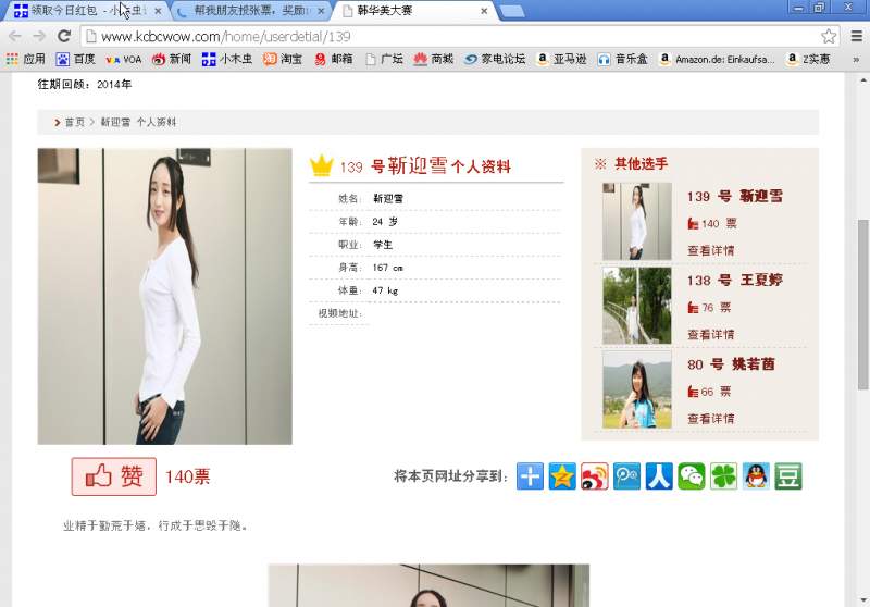 投票奖励10金币,截图为证! 在韩华美大赛 139号靳迎雪 来自山东泰安的姑娘,希望大家多多支持! 投票地址: http://www.kcbcwow.com/home/userdetial/139 QQ截图20141012112705.png [ Last edited by wuheng1678 on 2014-10-14 at 08:17 ] |