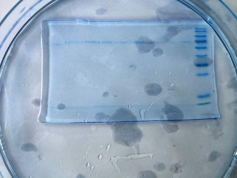 跑完PAGE后固定,G250染色,结果很诡异,一条带,如图所示。上样顺序是marker,50ng,20ng,10ng,50ng,5ng,2.5ng,50ng,blank,最后一个泳道没有加样品。奇怪的是我一次配了四块胶,而且是一起跑的,用的四种不同的染液,且染液都是新配的,染色时间也相同,只有这块胶是跑出这样的结果,别的胶正常。 IMG_1217.JPG |