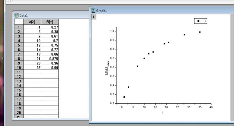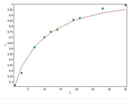 1. 取10项加和: 代码: Constant R=7.2e-6; Parameters D ; Variable t,y; Function y=1-6/Pi/Pi*( (exp(-D*t*1*Pi^2/R/R))/1+(exp(-D*t*4*Pi^2/R/R))/4+(exp(-D*t*9*Pi^2/R/R))/9+(exp(-D*t*16*Pi^2/R/R))/16+(exp(-D*t*25*Pi^2/R/R))/25+(exp(-D*t*36*Pi^2/R/R))/36+(exp(-D*t*49*Pi^2/R/R))/49+(exp(-D*t*64*Pi^2/R/R))/64+(exp(-D*t*81*Pi^2/R/R))/81+(exp(-D*t*100*Pi^2/R/R))/100 ); Data; 1 0.27 3 0.38 7 0.61 10 0.7 12 0.75 14 0.77 19 0.86 21 0.875 28 0.96 35 0.99 计算结果: 均方差(RMSE): 0.0256021597968399 残差平方和(SSE): 0.00655470586262925 相关系数(R): 0.996390989912923 相关系数之平方(R^2): 0.992795004779654 决定系数(DC): 0.987097099202013 卡方系数(Chi-Square): 0.00590587235987586 F统计(F-Statistic): 1102.34077821577 参数 最佳估算 ---------- ------------- d 3.86356306667109E-13 ====== 结果输出 ===== No 实测值y 计算值y 1 0.27 0.2698810 2 0.38 0.4390966 3 0.61 0.6166810 4 0.7 0.7005544 5 0.75 0.7440429 6 0.77 0.7804440 7 0.86 0.8491559 8 0.875 0.8699669 9 0.96 0.9224453 10 0.99 0.9536752 2. 取2项加和: 代码: Constant R=7.2e-6; Parameters D; Variable t,y; Function y=1-6/Pi/Pi*( (exp(-D*t*1*Pi^2/R/R))/1+(exp(-D*t*4*Pi^2/R/R))/4); Data; 1 0.27 3 0.38 7 0.61 10 0.7 12 0.75 14 0.77 19 0.86 21 0.875 28 0.96 35 0.99 结果: 均方差(RMSE): 0.0325007481060452 残差平方和(SSE): 0.010562986274526 相关系数(R): 0.998474767237474 相关系数之平方(R^2): 0.996951860809929 决定系数(DC): 0.979206822260666 卡方系数(Chi-Square): 0.011769969721828 F统计(F-Statistic): 2616.55206312704 参数 最佳估算 ---------- ------------- d 3.82147034699118E-13 ====== 结果输出 ===== No 实测值y 计算值y 1 0.27 0.3211259 2 0.38 0.4478023 3 0.61 0.6148640 4 0.7 0.6980395 5 0.75 0.7414623 6 0.77 0.7778878 7 0.86 0.8468149 8 0.875 0.8677436 9 0.96 0.9206826 10 0.99 0.9523570 |