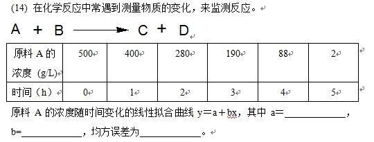原料A的浓度随时间变化的线性拟合曲线y=a+bx,其中a= ,b= ,均方误差为 。