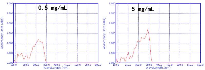 怎么感觉不是一个东西呢~~~楼主可以试试把5mg/ml的稀释10倍 能否得到和0.5mg/ml一致的吸收光谱
