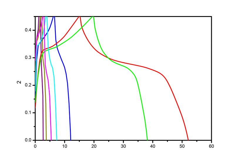 求助, 我做的超级电容器材料,为何在2A/g时的充电时间长于1A/g时的充电时间,见该图绿和红线。在文献中没有见到类似情况