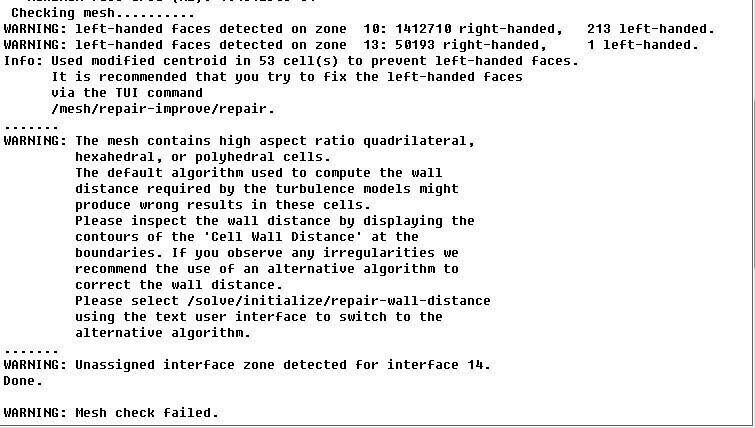 最近利用ICEM CFD绘制结构化网格,网格质量平均0.5左右,但是在导入到FLUENT 出现mesh check failed, 并显示“Warning:non-positive volumes exist”.具体显示见附图。。 希望虫友帮助下,不胜感激 CFD.jpg |