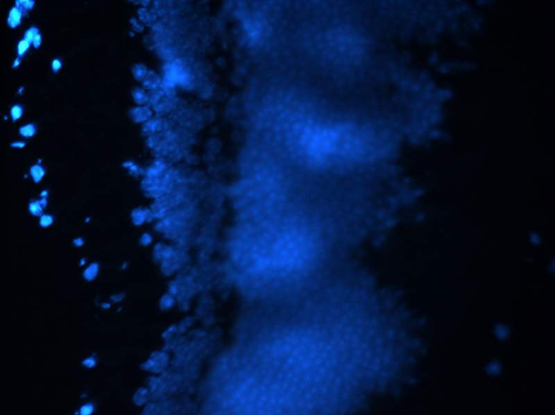 各位大侠好: 我染的是视网膜组织的冰冻切片,可是为什么会出现这样的结果,所有的片子基本都是这样的,外边这个层次总是不清楚,不对焦。各位有何高见? 我的步骤: 1. 取下组织后直接冻-80°冰箱 2. 拿出组织与切片机中 OCT包埋 3. 切片 温度-17° 4. 室温晾干过夜 5. 放入-80°冰箱 备用 6. 取出切片 与 pbs 常温 5min 7. 冰丙酮 10min 8. pbs洗5min 9. 1%bsa封闭1h 10、 pbs洗 11. 一抗 |