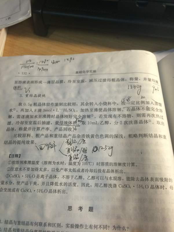 第一次结晶在表面形成一层晶膜时停止水浴加热,冷却至室温后进行抽滤,得到母液1。 第二次,进行重结晶,得到饱和溶液后,冷却至室温进行抽滤,然后得到母液2。 理论上来说应该第二次比第一次浓度高,颜色更深,但是我做出来第一次比第二次颜色深,是什么原因。 实验步骤如图所示。 IMG_2231.JPG IMG_2232.JPG |