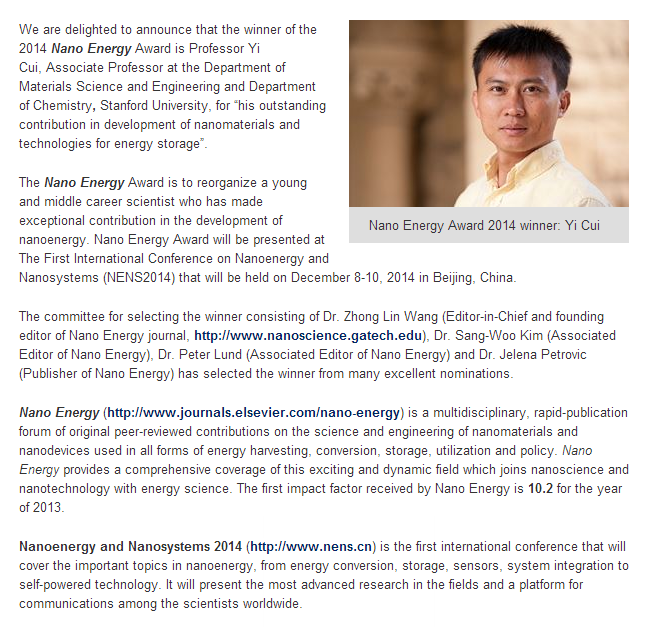 Nano Energy Award winner 2014——YI CUI(崔毅)已有4人参与
