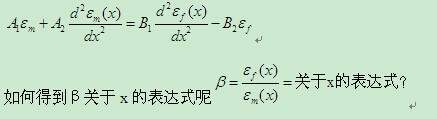 用拉式变换可以求得如下的形式: εm(x)=B1/A2*εf(x)-B1/A2*(B2/B1+A1/A2)/sqrt[A1/A2]*Integral{εf(x)*Sin[sqrt(A1/A2)*(t-x)]*dt,0,x} +α*Cos[sqrt(A1/A2)*x]+γ*Sin[sqrt(A1/A2)*x] 其中,α和γ均为可由A1、A2、B1、B2、εm(0)、εm'(0)、εf(0)、εf '(0)等表示的已知常数,它们可由比较系数法得到。 由此可以看出,由于两个函数之间不是比例关系,因此仅靠一个方程式是得不到β的值的。 |