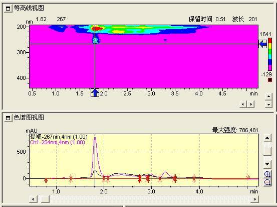用岛津LC20A高效液相色谱-二极管阵列检测器-荧光检测器法测定物质,得出等高线视图、色谱图视图、纯度视图后,如何分析该物质的最大吸收波长?