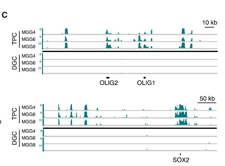 figure2C:(C) ChIP-seq tracks show H3K27ac signals for loci encoding TPC-specific TFs OLIG1, OLIG2, and SOX2. 其中TPC和DGC是两种不同处理方法下的同种细胞,MGG4\6\8是来源不同的GBM细胞。 |