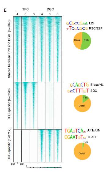 figure1E:Heatmap depicts genomic intervals (rows) enriched for H3K27ac in tumor models (cyan: high signal), clustered into groups of TPC-specific, DGC-specific, and shared regulatory elements. Shared elements tend to be located proximal to promoters, whereas the vast majority of TPC- and DGC-specific elements are distal. Motif analyses predict binding sites for TF families within each set of elements.