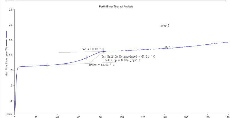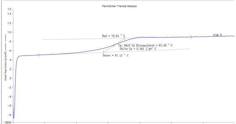 其实软件已经给出了聚合物的玻璃化转变温度,第一个为67.31°C,第二个为 63.56°C,楼主给出的DSC谱图基本也就分析这个了