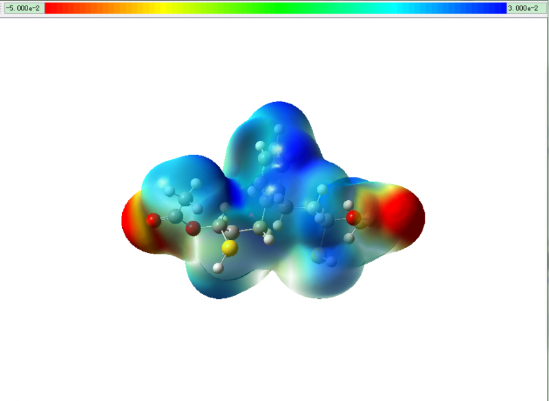 用GaussView打开*.fchk,从Results中选Surfaces,打开Surfaces and Cubes对话框,选取Cube Actions中的New Cube,从Kind中选取Total Density,然后点OK。选取Surface Actions中的New Mapped Surface,OK。出图。 Ctrl+D,出现Display Format的对话框,选取Surface的Transparent,使图形透明显示,更漂亮的静电势图到手。 |