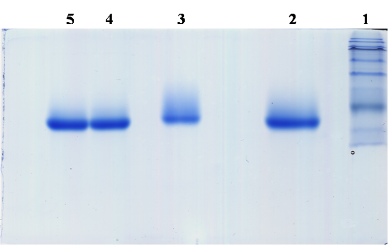 如图:15%的PAGE胶。右边1泳道边为预染marker,2,4,5为高盐样品,就是过完离子交换柱之后的有活性的样品,3泳道为2泳道脱盐之后的样品又用水溶的,跑出的胶如下图所示。